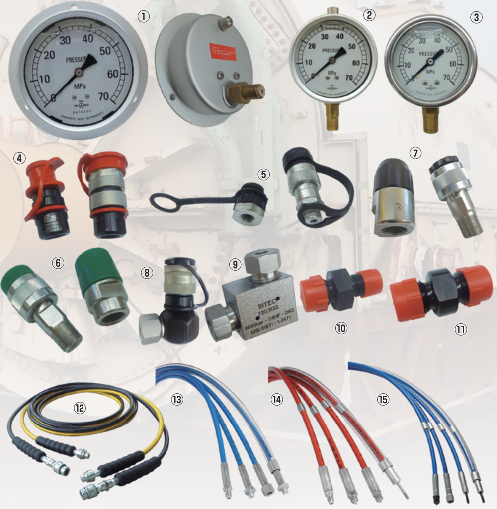①圧力ゲージ 100 φ ②圧力ゲージ 75 φ ③圧力ゲージ 60 φ ④ 300MPa カプラ⑤エナパック70MPa カプラ⑥大阪ジャッキ 70MPa カプラ⑦理研 70MPa カプラ⑧スイベルエルボ 250MPa ⑨ 90°ブロック 300MPa ⑩ニップル 300MPa - 200 MPa ⑪ニップル 300MPa - 3... -