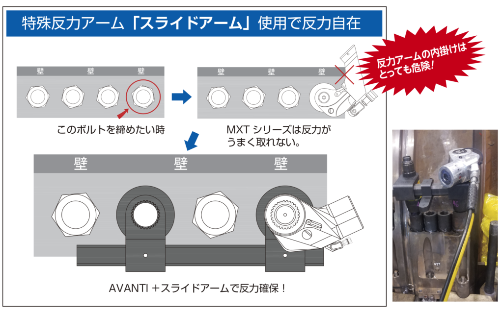 AVANTIシリーズのトルク出力域はもっとも広範囲に及びます。特殊な反力位置で様々なシーン、用途でAvantiシリーズには次世代のボルティングソリューションとして業界内で圧倒的な信頼が寄せられています。