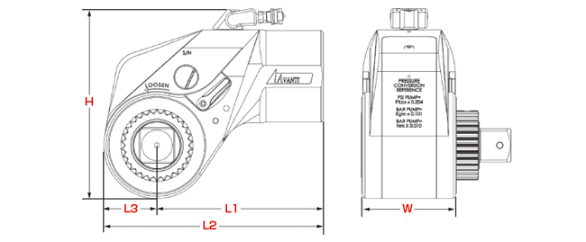 | 型 式 | 駆動軸 (in) | トルク値(Nm) | 重量 (kg) | L1 (mm) | L2 (mm) | L3 (mm) | H (mm) | W (mm) | |