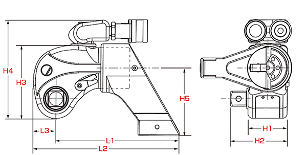 | 型 式 | 駆動軸 (in) | トルク値(Nm) | 重量 (kg) | L1 (mm) | L2 (mm) | L3 (mm) | H1 (mm) | H2 (mm) | H3 (mm) | H4 (mm) | H5 (mm) | |