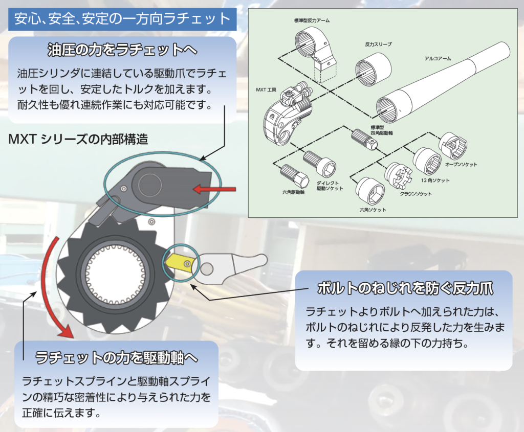 MXTシリーズは、より力強く、よ り早い締め付けを実現させたパイオ ニアです。工具内部の第二駆動爪は、 ラチェットが逆方向へ回転するのを 防ぎます。