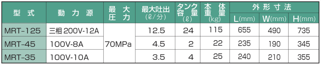 油圧レンチ用電動油圧ポンプ 2023 11/01 MR-Tech Original MRT-125 工場内使用向きです。 大型油圧レンチ向き、吐出量・ 静粛性に優れています。 MRT-45 小型・軽量で中・小型油圧レンチ向きで、電圧降下に優れています。 MRT-35 小型・軽量で経済的 中・小型油圧レンチ向きです。 MR-Tech Original エアートルクレンチ トルクガン J/DS/FLIP Series 精緻な再現性 軸力値を直読 超音波ボルト軸力計 BOLT-MAXⅡ 関連製品 油圧レンチ・テンション締付工具用 スペアパーツ カスタムメイド 倍力レンチ ナットスプリッター タービン用スペシャルツール 手動・油圧フランジアライメント 高周波ボルトヒーター ボルトテンショナー Tensioner